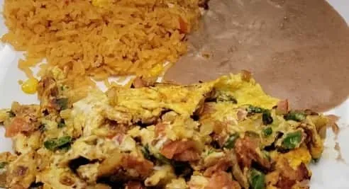 Onion, Bell Pepper, Red Sauce, Steak And 2 Eggs.